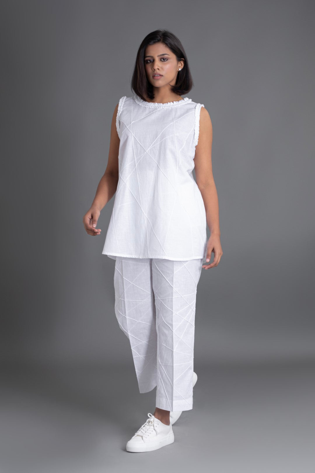- Sleeveless top in white with tone on tone all-around crazy pin tuck detail.