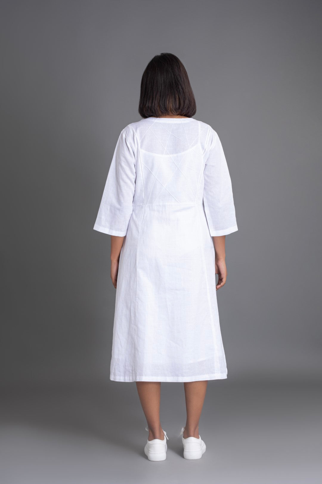 - Dress in white with all-around tone on tone crazy pin tuck detail.
